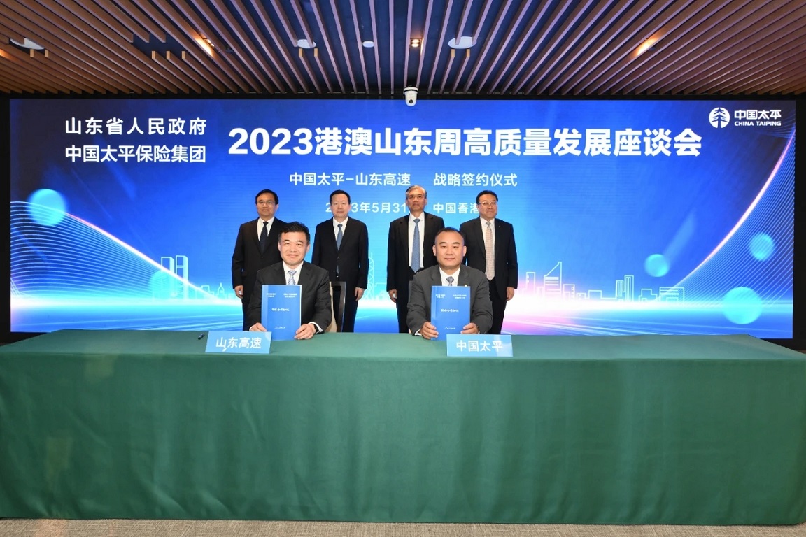 會談后,王思東、尹兆君,周乃翔、宋軍繼共同見證了中國太平與山東高速簽署戰略合作協議,中國太平副總經理李可東、山東高速董事長王其峰代表雙方簽約。